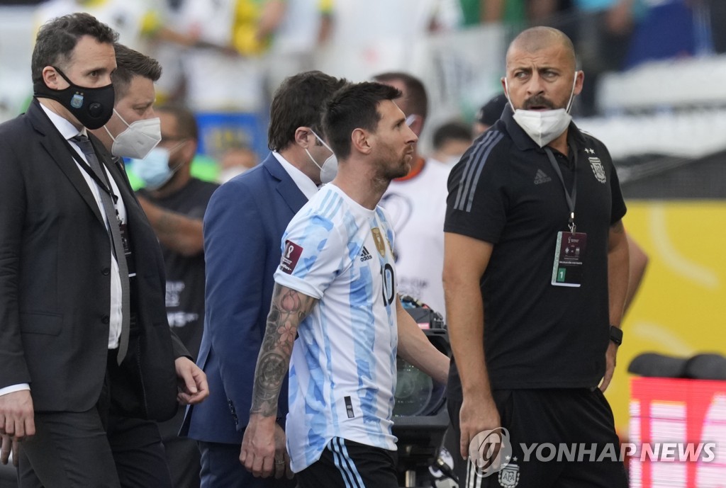 (서울=연합뉴스) 이영호 기자 = 브라질과 아르헨티나의 2022 카타르 월드컵 남미예선 6차전이 선발 출전한 잉글랜드 프리미어리그(EPL) 소속의 아르헨티나 선수 3명의 방역 조치 위반 때문에 킥오프 직후 중단되는 황당한 상황이 벌어졌다.