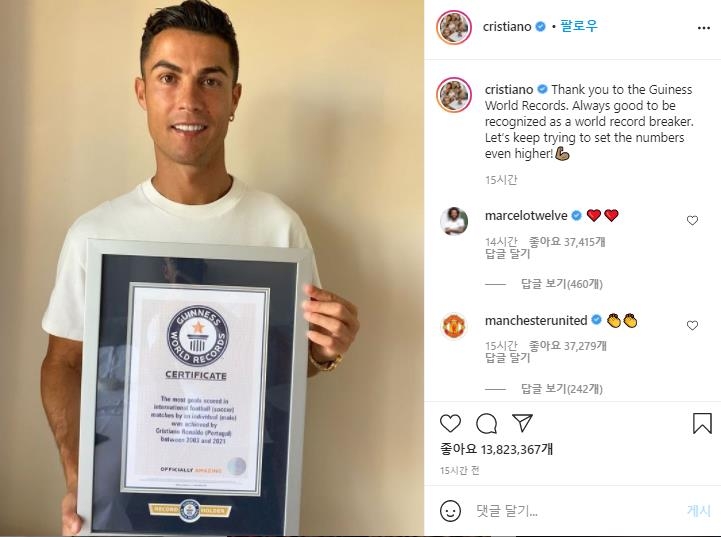 | ▲ A매치 통산 최다골로 기네스월드레코드 인증을 받은 호날두. [크리스티아누 호날두 인스타그램. 재판매 및 DB 금지] |