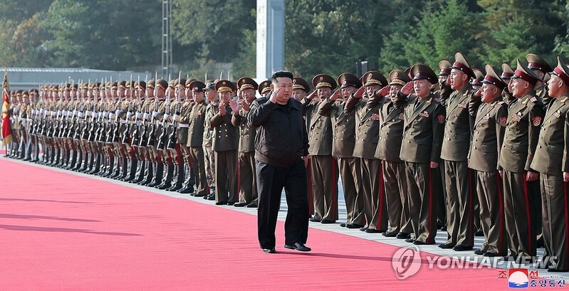 | ▲ North Korean leader Kim Jong-un (on carpet) inspects an honor guard during a visit to the North Korean Army's 2nd Corps Headquarters on Oct. 17, 2024, in this photo provided by the North's official Korean Central News Agency. Kim stressed again that South Korea is a foreign country and an apparent hostile country, according to the news agency. (For Use Only in the Republic of Korea. No Redistribution) (Yonhap) |