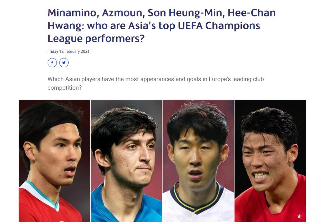 UEFA는 13일(한국시간) 홈페이지에 '미나미노, 아즈문, 손흥민, 황희찬 : 누가 UEFA 챔피언스리그에서 최고의 활약을 펼친 아시아 최고 선수일까'라는 기사를 통해 유럽 클럽대항전에서 활약한 아시아 선수들의 출전 및 득점 기록을 공개했다.