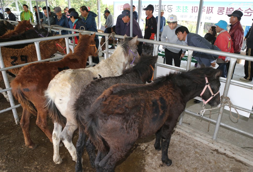▲ 첫 경매에 상장된 순수 혈통 제주마 (서귀포=연합뉴스) 지난 2013년 10월 15일 오후 제주도 서귀포시축협 가축시장에서 사상 처음 일반 농가를 대상으로 제주도축산진흥원이 자체 생산한 순수 혈통 제주마 50마리에 대한 경매를 시행했다. [연합뉴스 자료사진] |