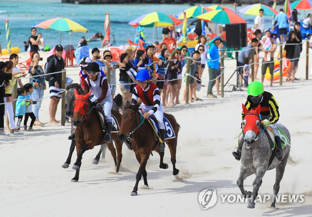 ▲ 백사장 달리는 제주마들 (제주=연합뉴스) 지난 2018년 7월 8일 제주시 애월읍 곽지해수욕장에서 렛츠런파크 제주 주최로 '제주마 해변경주'가 펼쳐지고 있다. [연합뉴스 자료사진] |