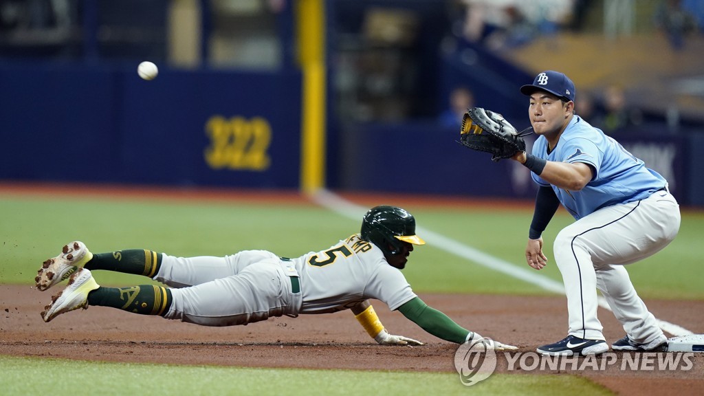 | ▲  In this Associated Press photo, Tampa Bay Rays' first baseman Choi Ji-man (R) prepares to catch a pickoff throw by starter Tommy Romero as Tony Kemp of the Oakland Athletics dives back to the bag during the top of the first inning of a Major League Baseball regular season game at Tropicana Field in St. Petersburg, Florida, on April 12, 2022. (Yonhap) |