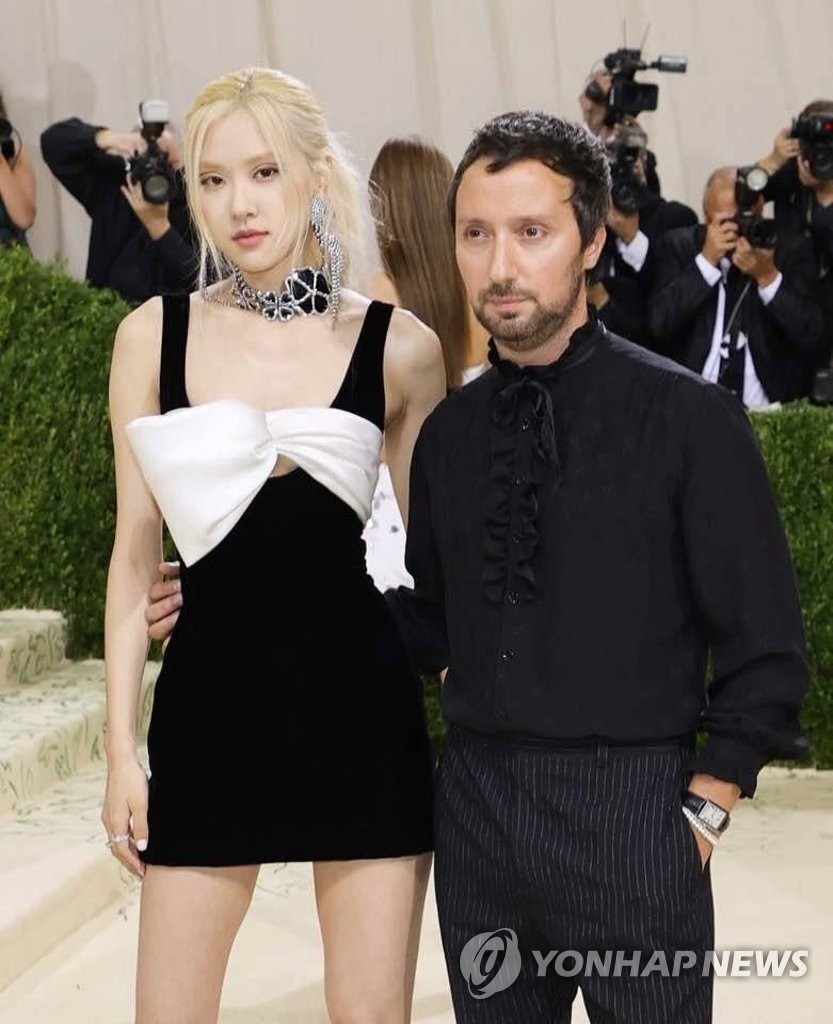 | ▲ 지난달 '멧 갈라' 참석한 블랙핑크 로제 (서울=연합뉴스) 그룹 블랙핑크 로제가 13일(현시시간) 뉴욕에서 열린 '멧 갈라'에서 생로랑의 크리에이티브 디렉터 안토니 바카렐로와 포즈를 취하고 있다. 2021.9.15
