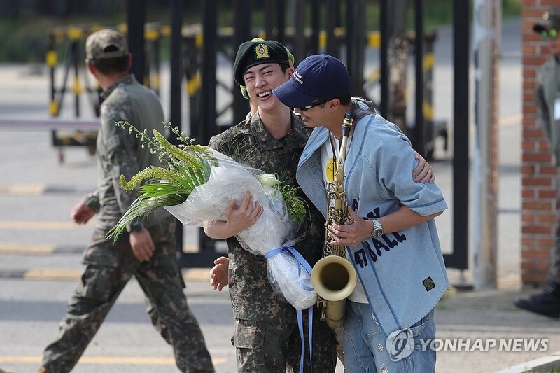 (서울=연합뉴스) 이태수 최주성 기자 = 그룹 방탄소년단(BTS)의 맏형 진이 12일 오전 멤버들의 환영 속에 약 1년 6개월 간의 군 복무를 마치고 육군 병장 만기 전역했다.