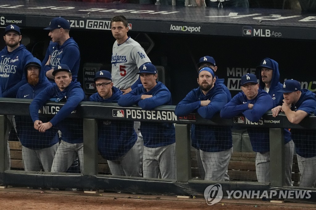 | ▲ 침울한 다저스 더그아웃 (애틀랜타 AP=연합뉴스) 로스앤젤레스 다저스 선수들이 24일(한국시간) 미국 조지아주 애틀랜타 트루이스트파크에서 열린 애틀랜타 브레이브스와의 2021 미국프로야구 메이저리그 내셔널리그 챔피언십시리즈(NLCS·7전4승제) 6차전에서 패색이 짙어지자, 무거운 표정으로 경기를 지켜보고 있다. |