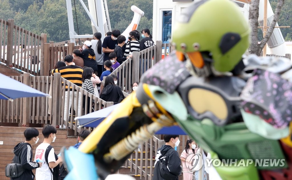 테마파크 관계자는 평소 금요일보다 이날 관람객이 40%가량 증가했다고 밝혔다. 2021.10.15 image@yna.co.kr |