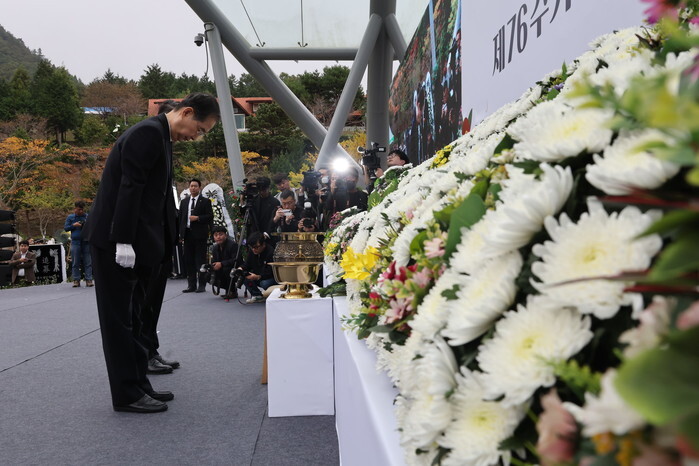 Prime Minister Han Duck-soo mourns for victims of the Yeosu-Suncheon uprising in a ceremony held at Korean Tea Culture Park in Boseong, South Jeolla Province, on Oct. 19, 2024. (Yonhap)