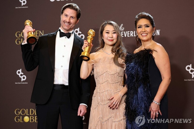 | ▲ 11일 골든글로브 2관왕 차지한 '케데헌' 매기 강 감독(가운데)과 제작진 [AFP=연합뉴스. 재판매 및 DB 금지] |