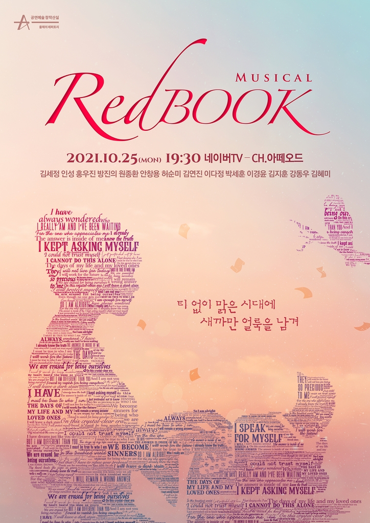 (서울=연합뉴스) 임동근 기자 = ▲ 뮤지컬 '레드북' 25일 온라인 중계 = 지난 8월 폐막한 뮤지컬 '레드북'이 오는 25일 오후 7시 30분 네이버TV를 통해 중계된다.