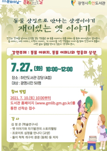 광명시 하안도서관은 우리나라 건국 신화, 전래동화 등에 나오는 동물 이야기를 들려주며 그 속에 담긴 의미를 재미있게 설명해 주는 '반려동물 주제 인문학 강연회'를 27일 개최한다.