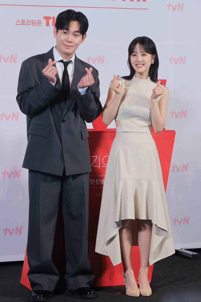 South Korean actress Park Bo-young and actor Ryu Kyung-soo, who star in the new drama "Our Unwritten Seoul," pose for a photo during a publicity event in Seoul on May 21, 2025. The first episode of the drama will be aired by the local cable TV network tvN on May 24. (Yonhap)