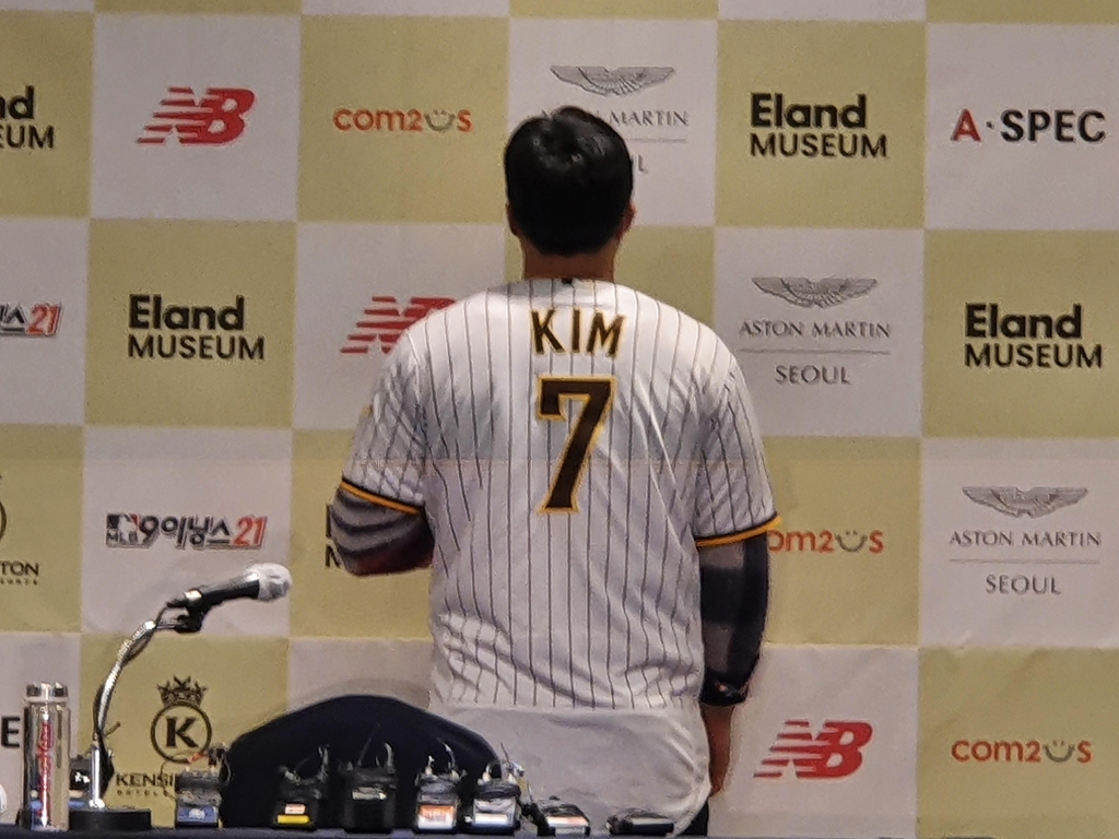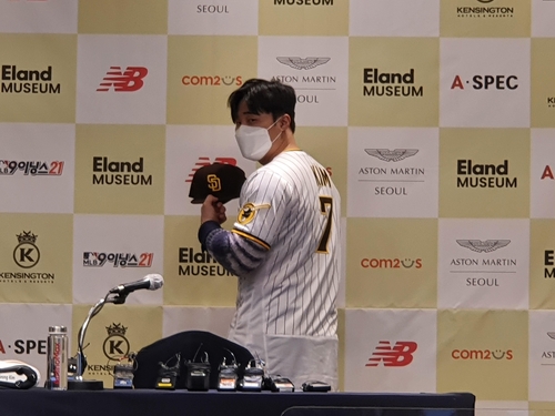 ▲ 기자회견 하는 김하성 (서울=연합뉴스) 하남직 기자 = 샌디에이고 파드리스와 계약한 김하성이 8일 서울시 영등포구 여의도동 켄싱턴 호텔에서 열린 기자회견 중 취재진의 질문을 듣고 있다.