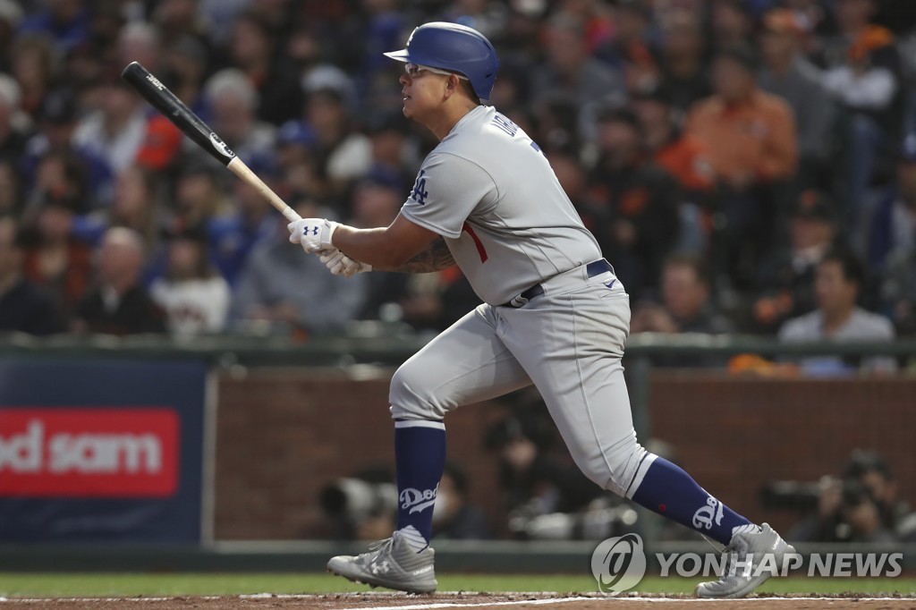 ▲ 결승타 치는 '투수' 우리아스 (샌프란시스코 AP=연합뉴스) 로스앤젤레스 다저스 왼손 투수 훌리오 우리아스가 10일(한국시간) 미국 캘리포니아주 샌프란시스코의 오라클파크에서 열린 내셔널리그 디비전시리즈 2차전, 2회초에 결승타를 치고 있다. 이날 선발 투수로 나선 우리아스는 선발승을 챙기고, 결승타까지 쳤다.