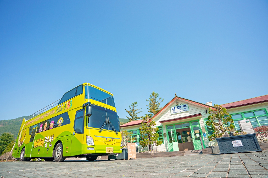 | ▲ 나전역과 정선군 2층 관광버스 [정선군 제공.재판매 및 DB 금지] |