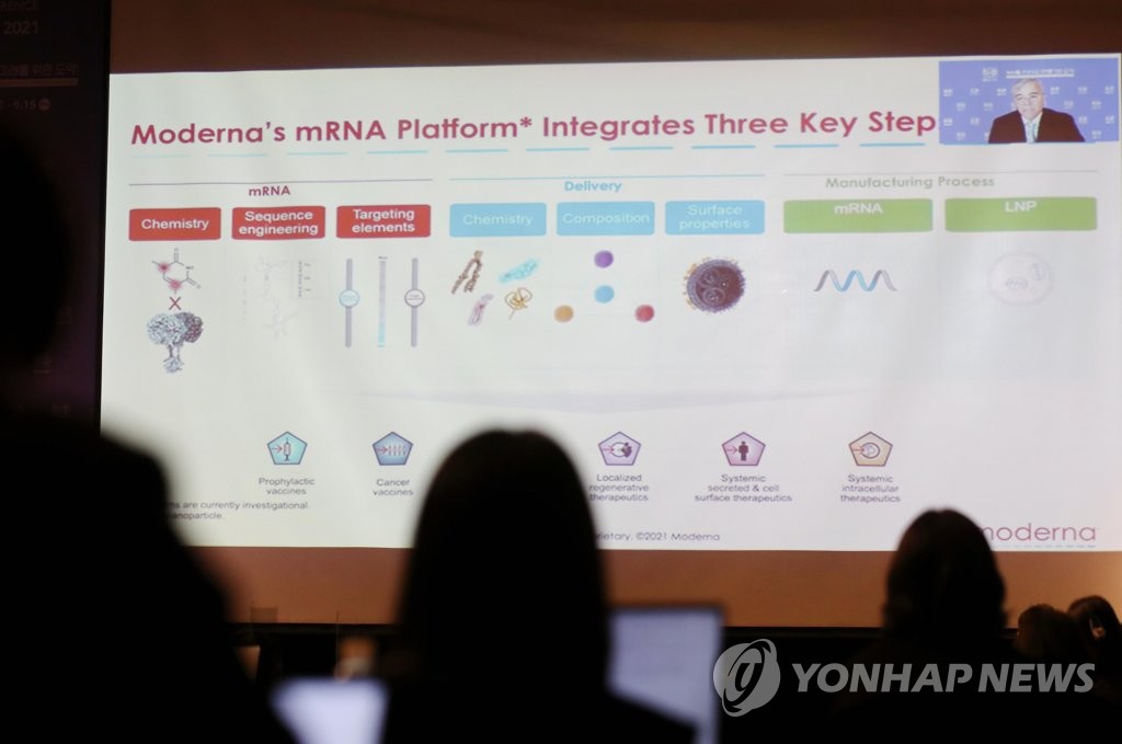 | ▲ '코로나19' 백신 개발 및 mRNA 향후 전략 발표' (서울=연합뉴스) 이재희 기자 = 14일 오전 서울 강남구 그랜드인터콘티넨탈서울파르나스 호텔에서 열린 '2021 글로벌 바이오 콘퍼런스'에서 랜달 하이어 모더나 글로벌메디컬어페어 SVP가 화상통화로 발표하고 있다. 2021.9.14 scape@yna.co.kr |