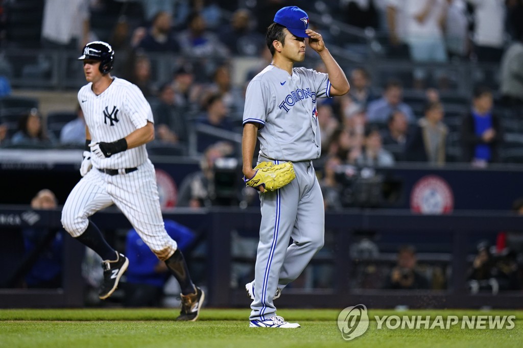 | ▲ In this Associated Press photo, Yusei Kikuchi of the Toronto Blue Jays (R) reacts to a two-run home run by Aaron Hicks of the New York Yankees during the bottom of the second inning of a Major League Baseball regular season game at Yankee Stadium in New York on April 12, 2022. (Yonhap) |