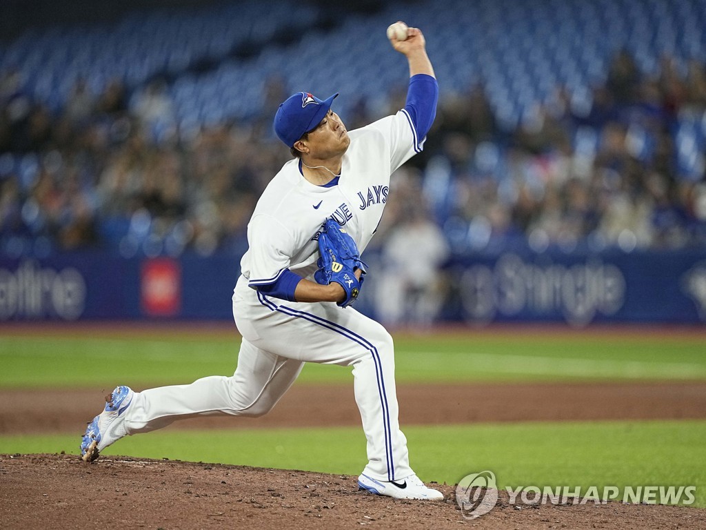 | ▲ In this USA Today Sports photo via Reuters, Ryu Hyun-jin of the Toronto Blue Jays pitches against the Texas Rangers in the top of the second inning of a Major League Baseball regular season game at Rogers Centre in Toronto on April 10, 2022. (Yonhap) |