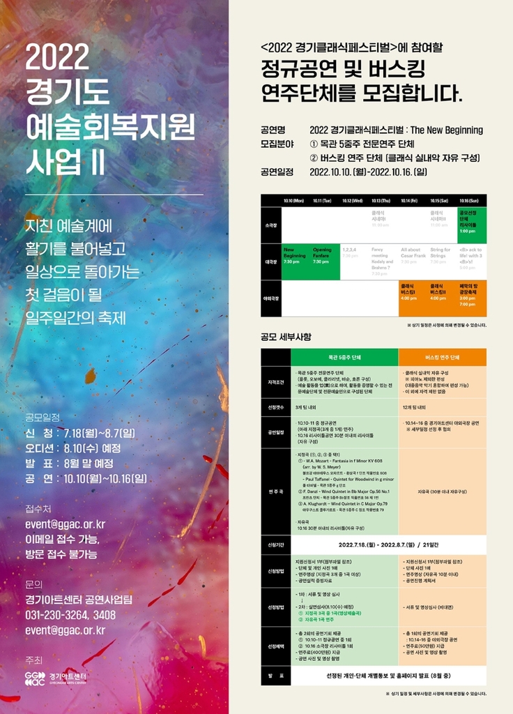 오는 10월 개최 예정인 '2022 경기 클래식페스티벌'에 출연할 예술인도 공모한다.