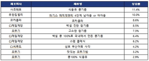 사조해표의 '식용유 콩기름'이 11.4% 올라 가격 상승률이 가장 높았고 그다음으로 유한킴벌리의 '매직핏팬티 4단계'(10%), '코카콜라'(8.6%) 등의 순이었다.