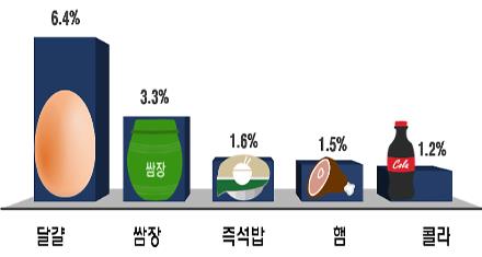 쌈장(3.3%)과 즉석밥(1.6%), 햄(1.5%), 콜라(1.2%) 등의 가격이 올랐다.