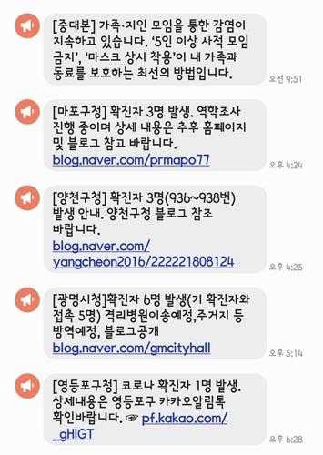 | ▲ This undated image shows multiple coronavirus-related emergency text messages sent out from the Central Disaster and Safety Countermeasures Headquarters and local governments. (Yonhap) |