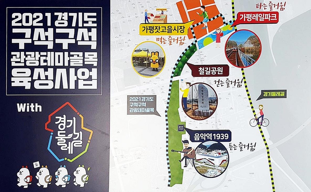 (가평=연합뉴스) 김도윤 기자 = 경기 가평군은 올해 말까지 경춘선 폐철로를 따라 음악역 1939∼철길공원∼잣고을 전통시장∼레일바이크 1.2㎞를 연결한 추억 관광상품을 개발한다고 12일 밝혔다.