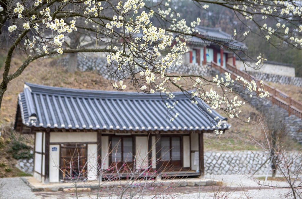 (부여=연합뉴스) 충남 부여군 규암면 진변리 백강마을의 부산서원 앞에서 자생하는 매화나무(일명 부여동매·충남문화재자료 제122호)가 꽃을 피워 23일 아름다운 자태를 뽐내고 있다.