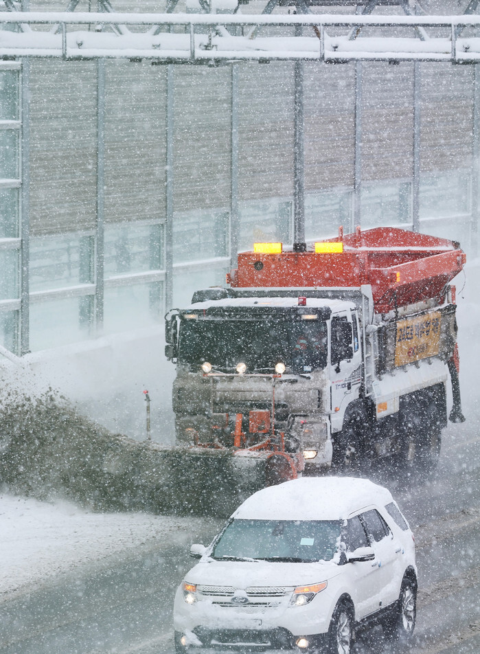 A truck plows snow on a section of the Gyeongbu Expressway near Yongin, south of Seoul, on Jan. 28, 2025. (Yonhap)