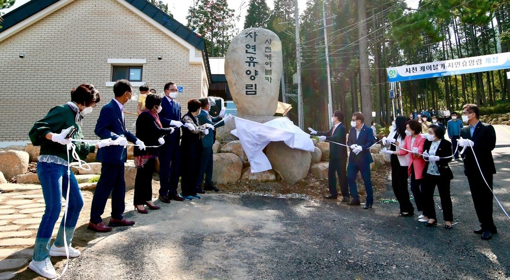 (사천=연합뉴스) 지성호 기자 = 경남 사천시는 27일 편백향 가득한 초록빛 힐링공간 '사천 케이블카 자연휴양림' 개장식을 했다.