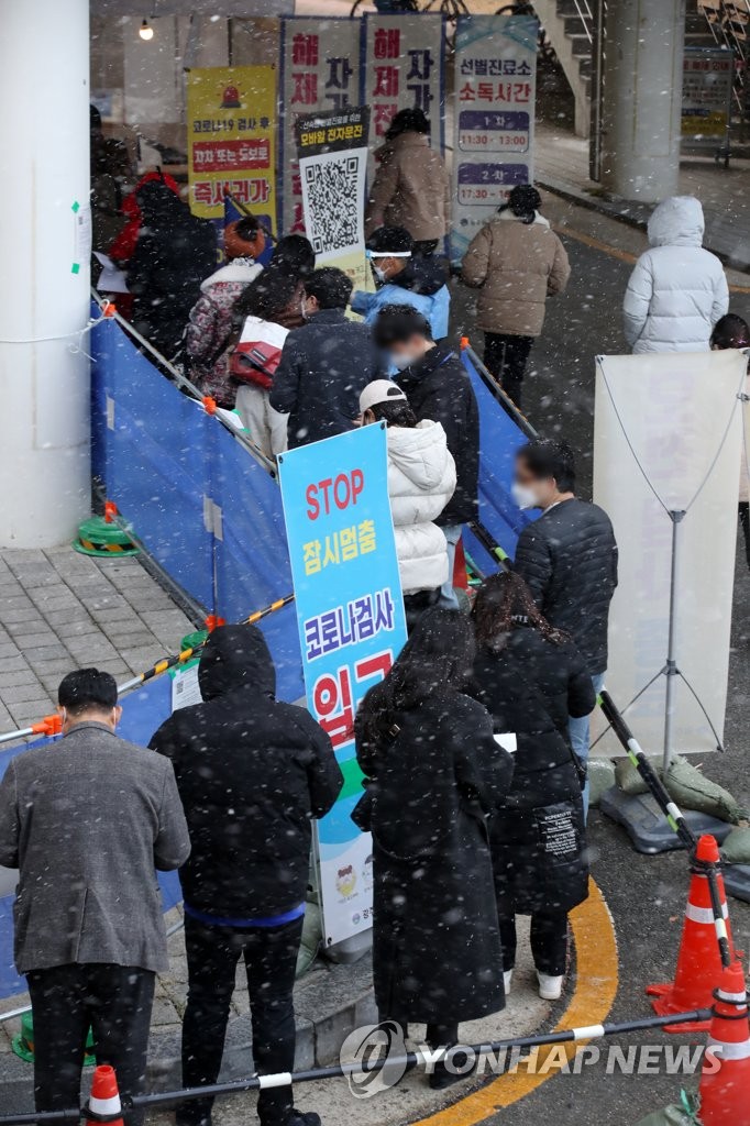 | ▲ People in thick winter clothes wait in line for coronavirus tests at a pop-up screening clinic in the southwestern city of Gwangju on Dec. 17, 2021, as snow falls, with the mercury dipping to a low of 1 C. South Korea's new coronavirus cases stayed above 7,400 for the third consecutive day, with the country set to restore tight social distancing and other virus curbs to contain the fast spread of the virus. (Yonhap) |