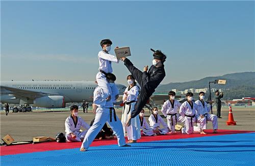(서울=연합뉴스) 배진남 기자 = 세계태권도연맹(WT) 시범단이 20일 경기도 성남시 서울공항에서 열린 서울 국제 항공우주 및 방위산업 전시회 2021(서울 ADEX 2021) 개막식의 식전 공연으로 태권도 시범을 선보였다.