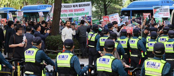 Police strengthen security as supporters of the Palestinian cause march during a rally in Seoul on Oct. 11, 2023, in the wake of Israeli air strikes on the Gaza Strip following the Hamas Palestinian militant group's terror attack on Israel. (Yonhap)