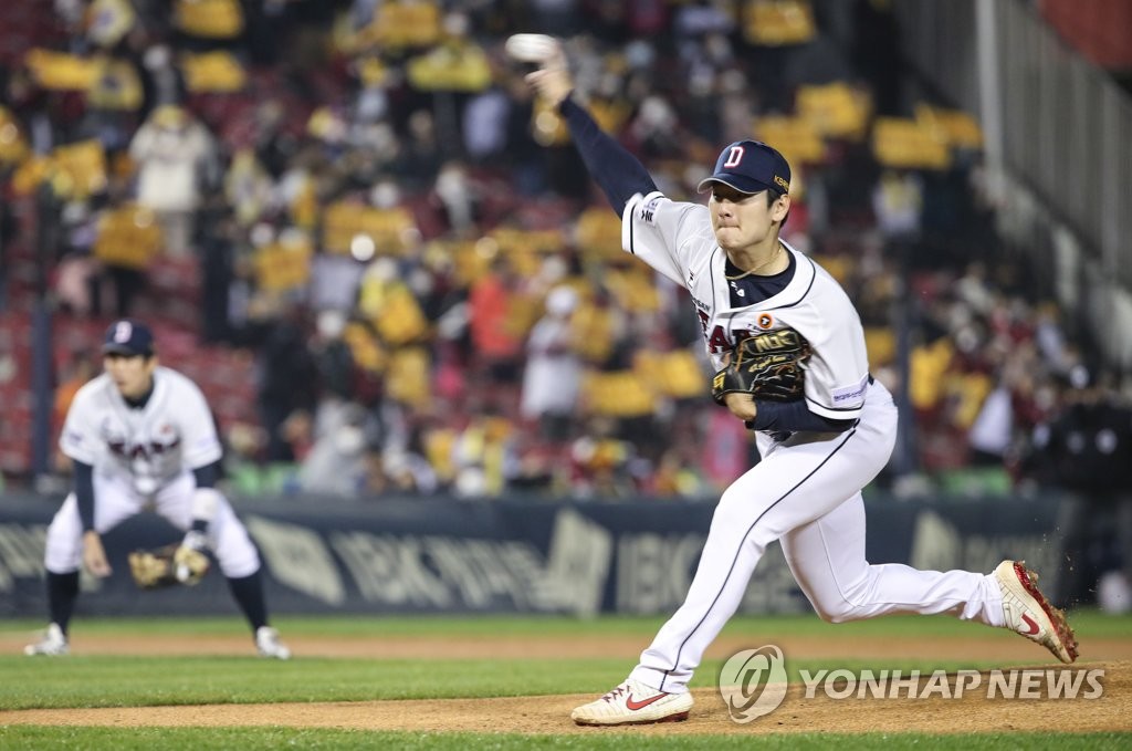 | ▲ In this file photo from Nov. 5, 2021, Gwak Been of the Doosan Bears pitches against the LG Twins during the top of the first inning of Game 2 of the first round in the Korea Baseball Organization postseason at Jamsil Baseball Stadium in Seoul. (Yonhap) |