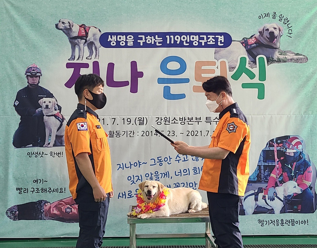 이 소방위는 "119구조견은 평생을 국민 생명을 구조해야 한다는 소명으로 헌신하는 제2의 119구조대원"이라며 "지나가 마지막 날까지 행복하게 살기를 간절히 바란다"고 말했다.