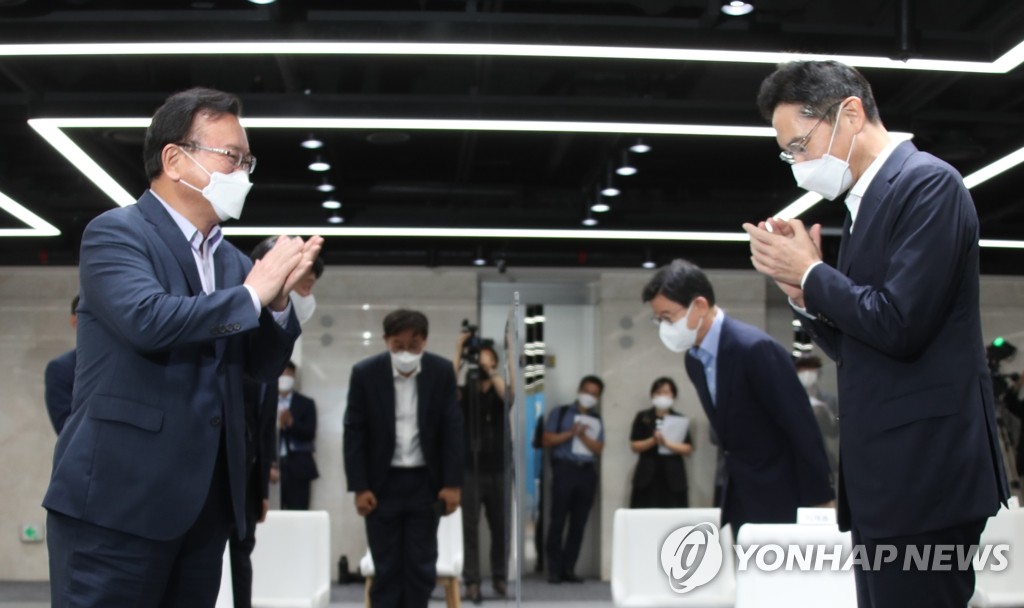 | ▲ 청년교육 간담회 마친 김부겸 총리와 이재용 부회장 (서울=연합뉴스) 김승두 기자 = 김부겸 국무총리(왼쪽)가 14일 서울 서초구 '삼성 청년 소프트웨어 아카데미(SSAFY)' 교육 현장을 방문, 간담회를 마치고 이재용 삼성전자 부회장(오른쪽)과 박수치고 있다. kimsdoo@yna.co.kr |