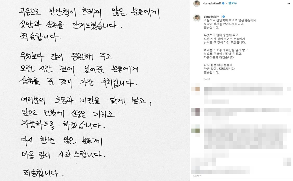 | ▲ 김동완 사과문 [김동완 인스타그램 캡처. 재판매 및 DB 금지] |