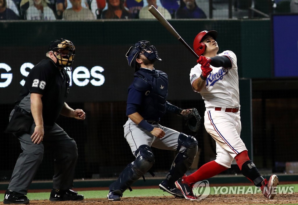 | ▲ In this Getty Images file photo from Aug. 12, 2020, Choo Shin-soo of the Texas Rangers (R) watches the flight of his sacrifice fly against the Seattle Mariners in the bottom of the eighth inning of a Major League Baseball regular season game at Globe Life Field in Arlington, Texas. (Yonhap) |