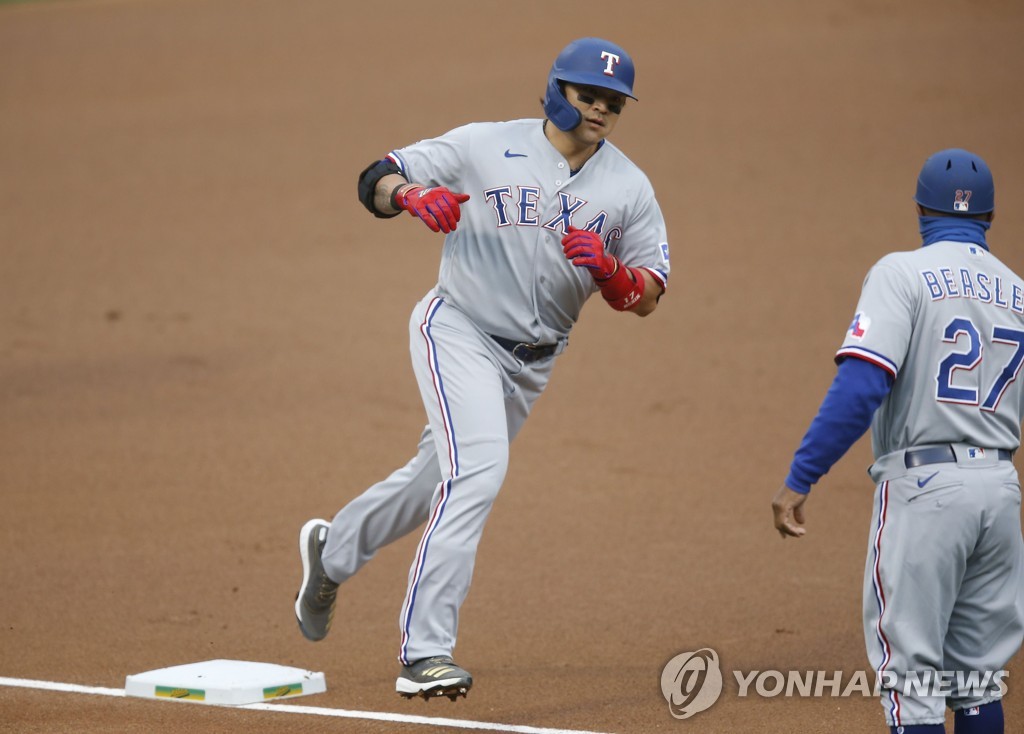 | ▲ In this Getty Images file photo from Aug. 5, 2020, Choo Shin-soo of the Texas Rangers (L) rounds third base after hitting a solo home run against the Oakland Athletics in the top of the first inning of a Major League Baseball regular season game at Oakland-Alameda County Coliseum in Oakland, California. (Yonhap) |