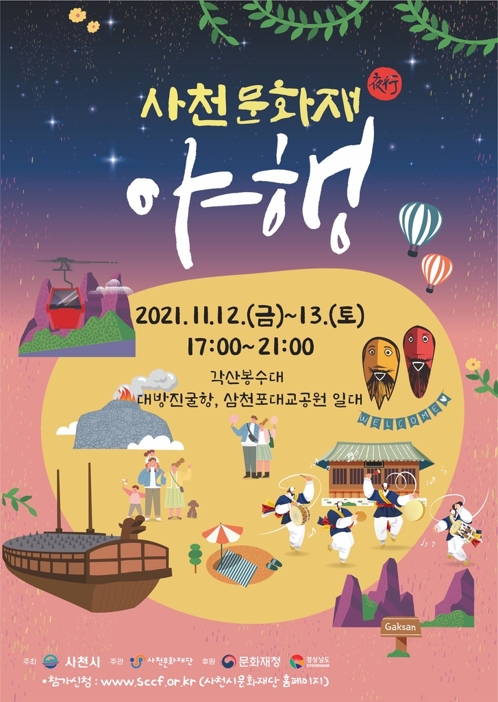 (사천=연합뉴스) 지성호 기자 = 경남 사천의 문화재를 활용한 야간관광콘텐츠 사업인 '2021 사천문화재 야행'이 오는 11월 12일부터 13일까지 대방진굴항, 각산 봉수대, 삼천포 대교공원 일원에서 열린다.