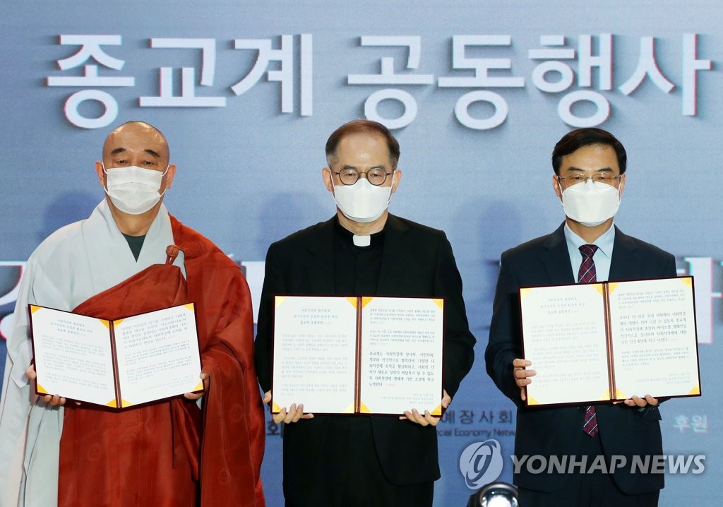 (서울=연합뉴스) 양정우 기자 = 천주교와 불교, 개신교 등 3대 종단은 7일 서울 명동대성당 꼬스트홀에서 종교계 공동행사를 열고 '코로나19' 장기화로 인한 위기극복을 위해 사회적 경제 활성화에 나서기로 다짐했다.