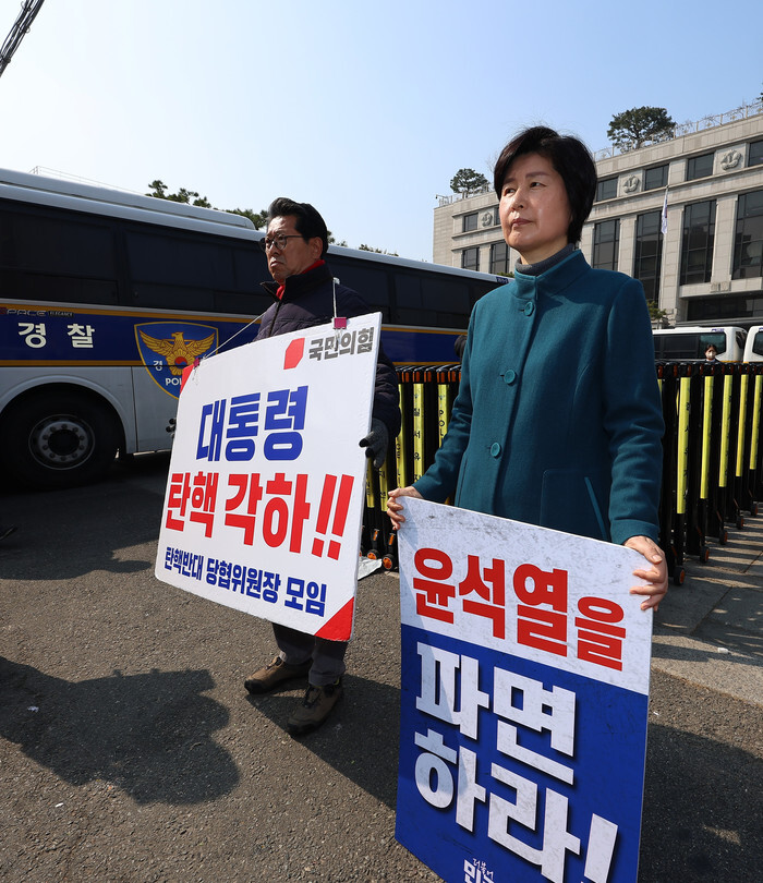 Baek Hye-ryun (R), a lawmaker of the main opposition Democratic Party, and Hong Yoo-oh, leader of a regional chapter of the ruling People Power Party in Suwon, stage separate solo rallies in front of the Constitutional Court in Seoul on March 21, 2025. Hong is calling for the court to reject an opposition-led motion to impeach President Yoon Suk Yeol in connection with his short-lived imposition of martial law in December, while Baek is holding a banner saying, "Remove Yoon from Office." (Yonhap)