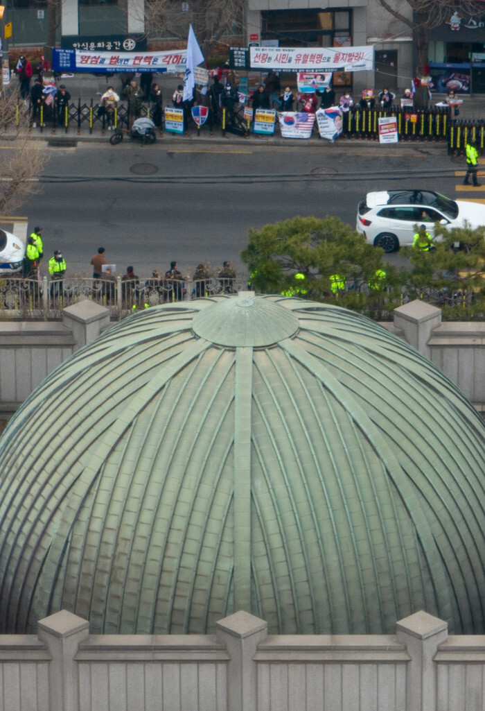 This aerial view, taken March 12, 2025, shows supporters of President Yoon Suk Yeol staging a rally in support of Yoon near the Constitutional Court in Seoul on the 15th day since the court's final hearing on Yoon's impeachment trial. The court has yet to set a date for handing down a decision on whether to remove him from office or reinstate him over his brief imposition of martial law in early December, although it has typically taken the court some two weeks after the final hearing to do so in the past. (Yonhap)