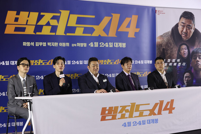 The stars of the new movie "The Roundup: Punishment" -- Lee Dong-whee, Kim Moo-yeol, Ma Dong-suk and Park Ji-hwan (L to 2nd R) -- along with director Hur Myung-hyeng (R) -- attend a publicity event in Seoul on April 15, 2024. The fourth installment of the box office hit "The Outlaws" is set to be released on April 24. (Yonhap)