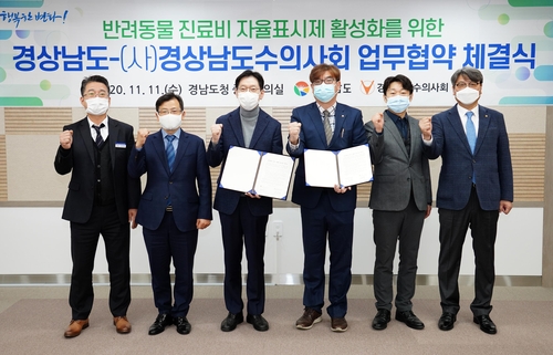 (창원=연합뉴스) 황봉규 기자 = 경남도는 11일 도청 중앙회의실에서 경남수의사회와 전국 첫 반려동물 진료비 자율표시제 활성화에 함께 손잡았다.