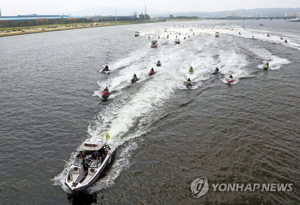 | ▲ 포항 형산강 위 수상오토바이 (포항=연합뉴스) 손대성 기자 = 27일 경북 포항시 남구 해도동 형산강에서 전국 수상오토바이 동호인이 130여 대에 나눠 타고 포항 일대 해변을 둘러보기 위한 '2021 포항 영일만 연합투어'를 시작하고 있다.