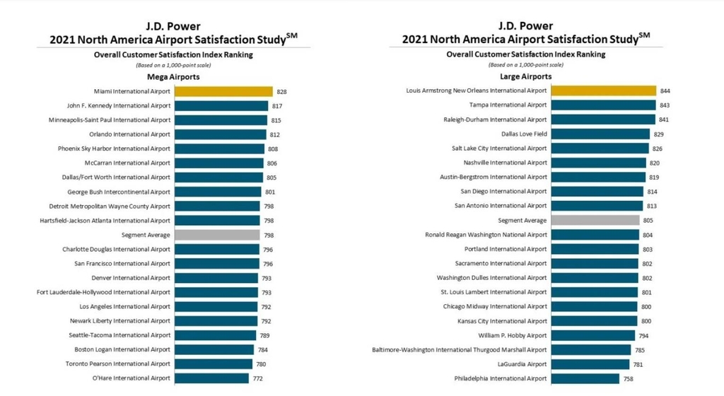 이용객 만족도가 가장 높게 나타난 공항은 마이애미 국제공항이었다. 지난해 2위였던 마이애미공항은 올해 828점을 얻으며 1위를 차지했다.