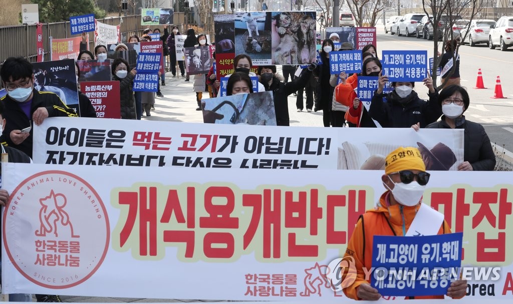 | ▲ "개·고양이 식용 종식" 1500만 반려인 연대 및 동물단체 회원들이 지난 2월 26일 오전 세종시 정부세종청사 농림축산식품부 앞에서 개·고양이 등 식용 반대, 동물보호법 개정법률의 빠른 통과를 촉구하는 기자회견을 열고 있다. [연합뉴스 자료사진] |
