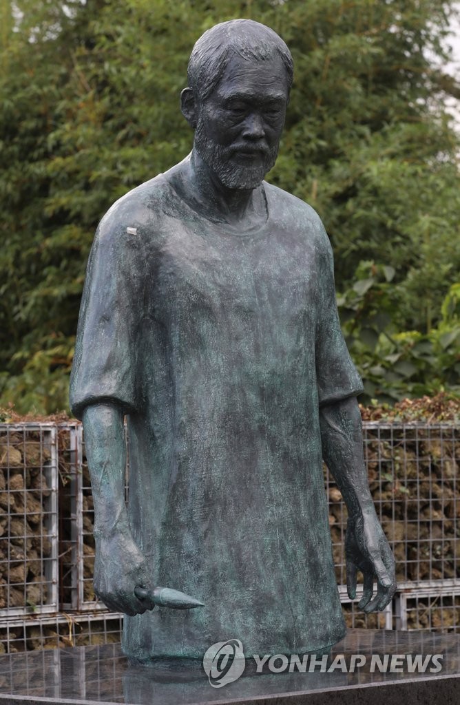 | ▲ 김창열 화백 조각상 (제주=연합뉴스) 박지호 기자 = 8일 오후 제주시 한림읍 월림리 김창열미술관에서 김창열 화백 조각상 제막식이 열렸다. 사진은 제막된 김창열 화백 조각상 모습. 2021.10.8 jihopark@yna.co.kr |