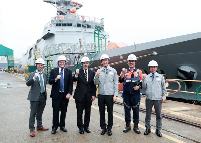 A group led by U.S. Ambassador to South Korea Philip Goldberg (3rd from L) poses with HD Hyundai Heavy Industries executives during a visit to the South Korean shipbuilder's shipyard in Ulsan, 299 kilometers southeast of Seoul, on July 15, 2024. (PHOTO NOT FOR SALE) (Yonhap)
